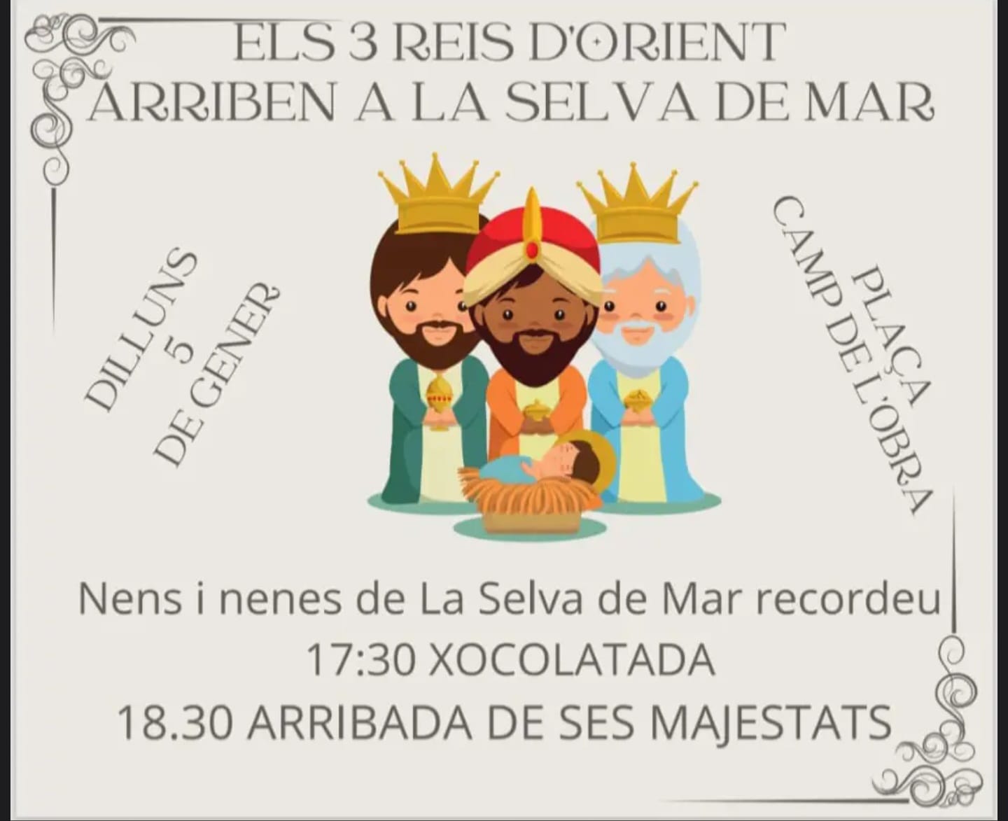 Arribada dels Reis d’Orient Dilluns 5 de gener Nens i nenes de La Selva de Mar, recordeu que a les 17:30h. hi haurà XOCOLATADA a La Plaça Camp de L’Obra mentre esperem l’arribada de Ses Majestats. 18:30h. Arribada de Ses Majestats.