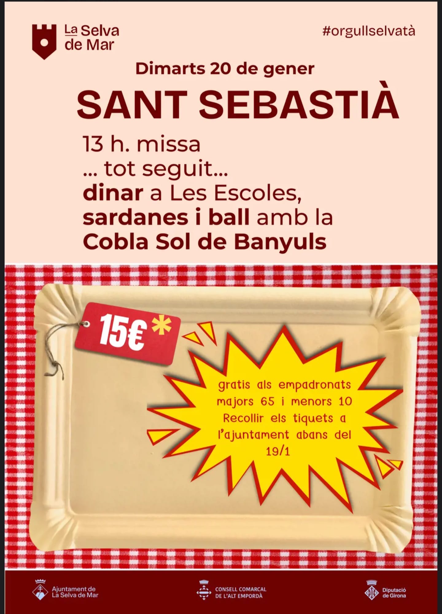 Festa de Sant Sebastià Dia: dimarts 20 de gener 13h. Missa popular Tot seguit, dinar popular a Les Escoles. Sardanes i Ball amb la Cobla Sol de Banyuls. Preus: Cal RECOLLIR TIQUETS A L’AJUNTAMENT abans del 19 de gener. Preu per dinar: 15€ Gratuït als empadronats majors de 65 i menors de 10 anys.